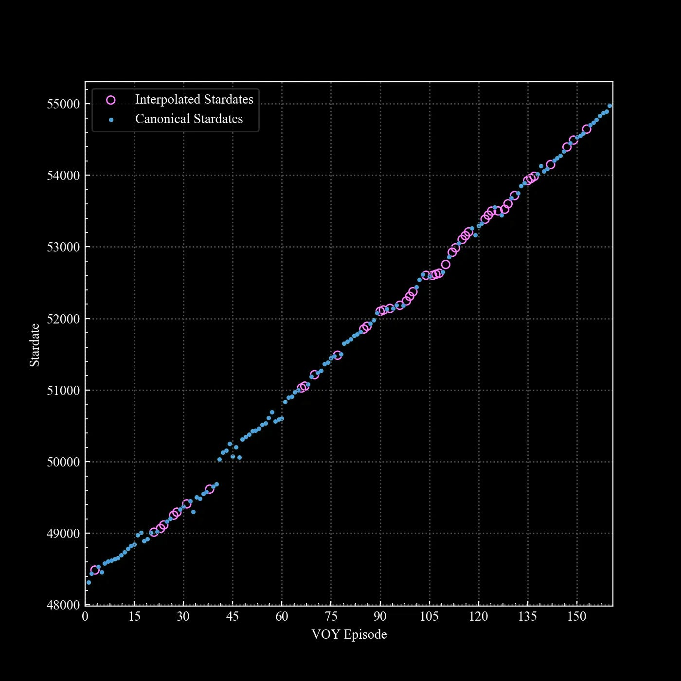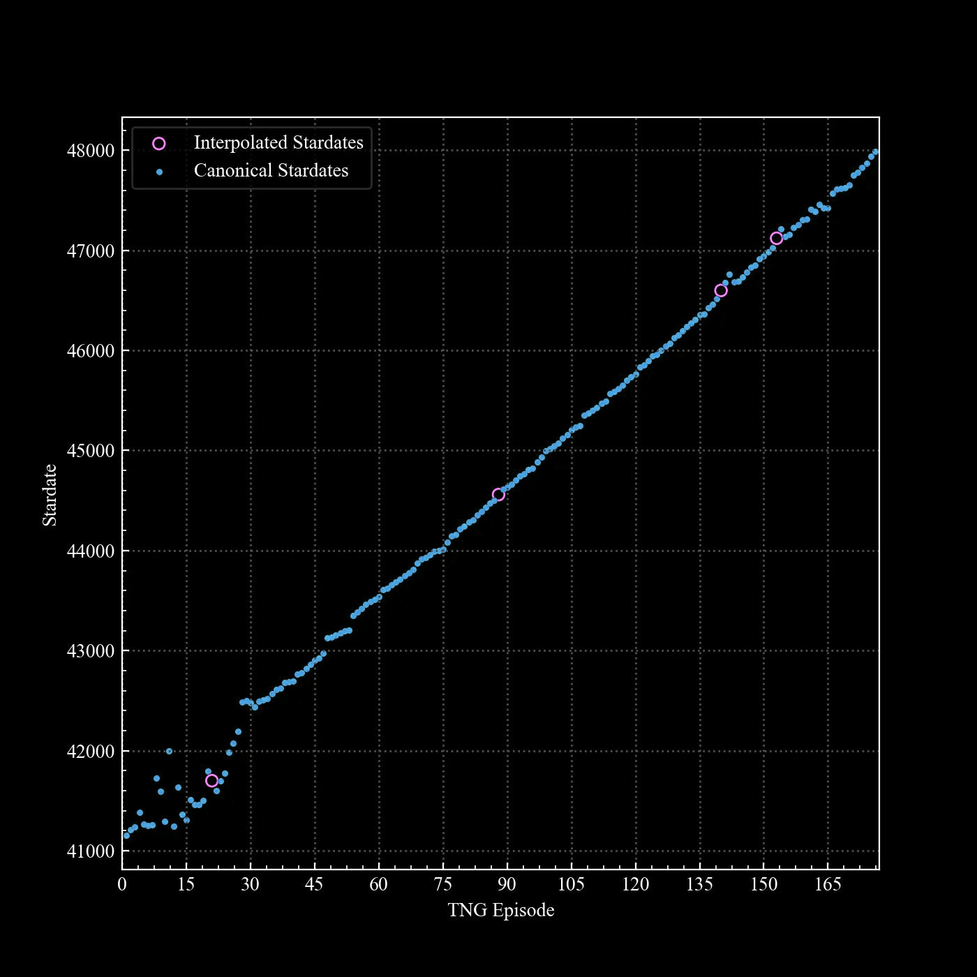 So beset have I been by DS9’s stardate deficiency, that I have manually interpolated many stardates, supporting various projects, including how many stardate units pass in a year and determining the orbit of the planet Bajor based on the varying travel time to DS9. I realised in the last two weeks, that I should have long ago written some Python code to interpolate all of the missing stardates for me. I have now done this, and the result is a complete set of stardates for all episodes of 24 th century Star Trek , which may be found in the tables below , with CSV files in Appendix 1 .