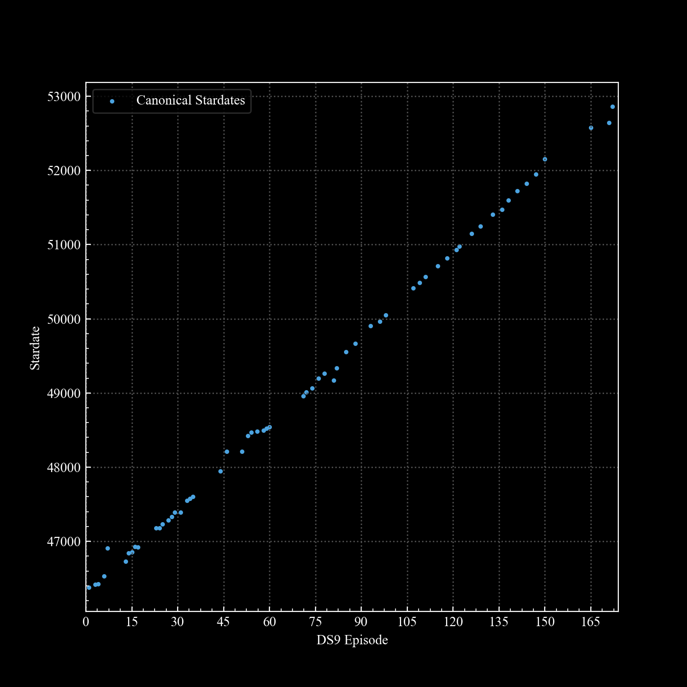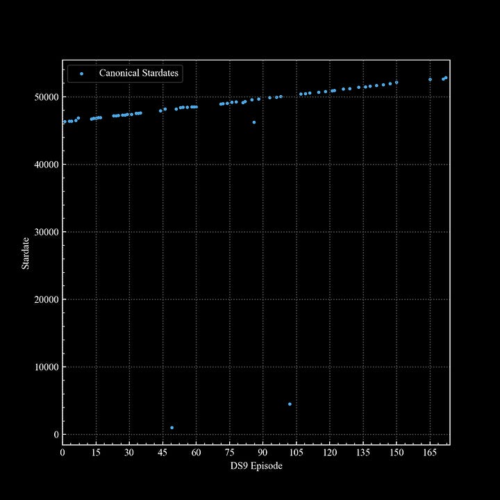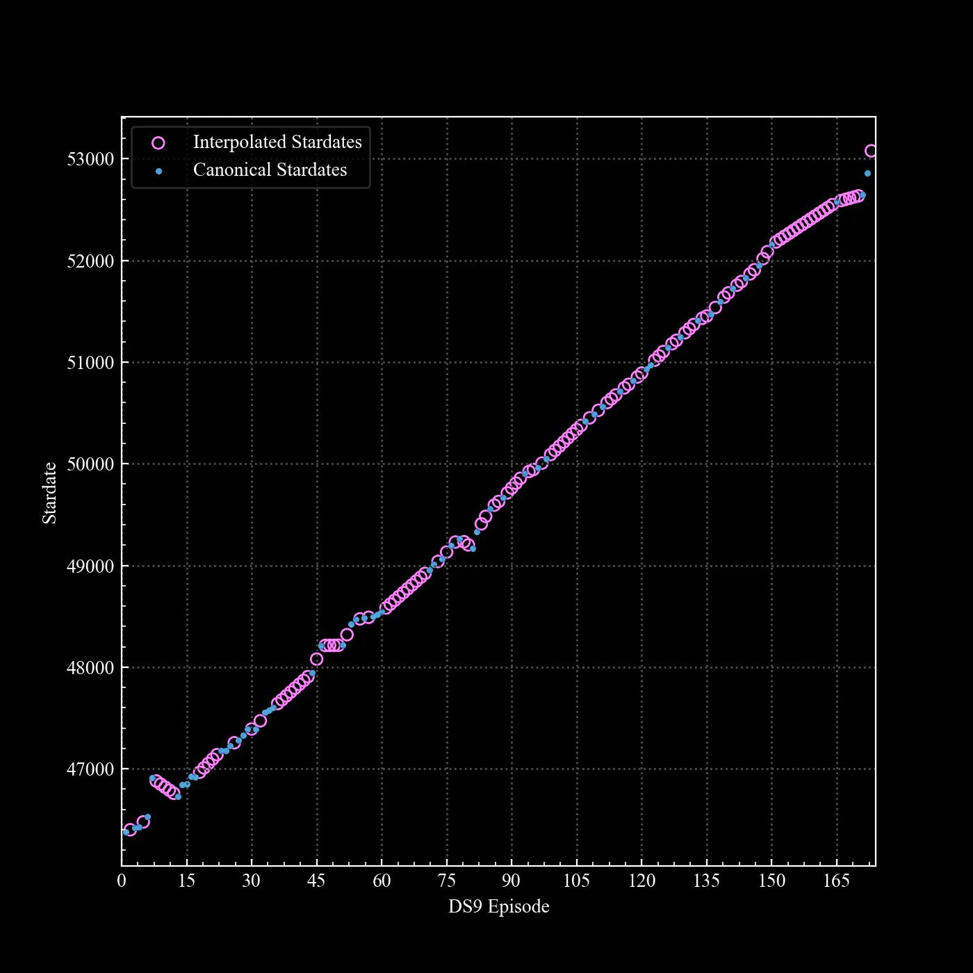 Figure 2: Interpolated stardates used to demonstrate how DS9 population changes with time. The accuracy of these interpolated stardates depends upon the assumption that stardates progress linearly, a premise which occasionally is contradicted in canon. The first seasons of both TNG and DS9 show substantial non-linearity, as can be seen in Figures 4 and 5. TNG’s first season is particularly noisy and DS9’s has a large outlier that results in stardates momentarily running backwards . However, the rest of TNG is very strictly smooth, with only a couple of deviations. Linearity is broadly true for Voyager also, as indicated by Figure 6.
