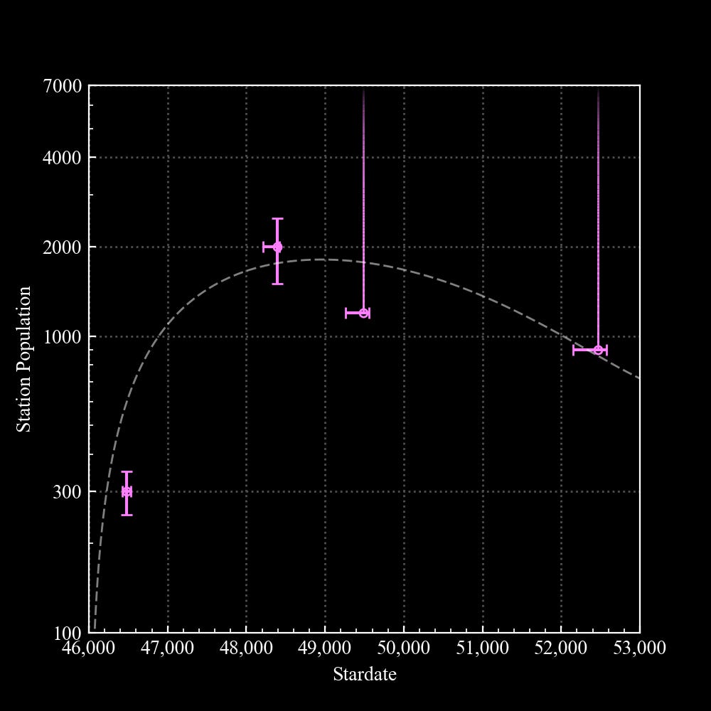 Using interpolation, it is possible to produce Figure 2 from the population data noted earlier. Interpolated stardates do have some error, which is reflected in the large horizontal bars on the plot, but the accuracy is sufficient to show that DS9’s population increases considerably between stardates 46,500 and 48,400.